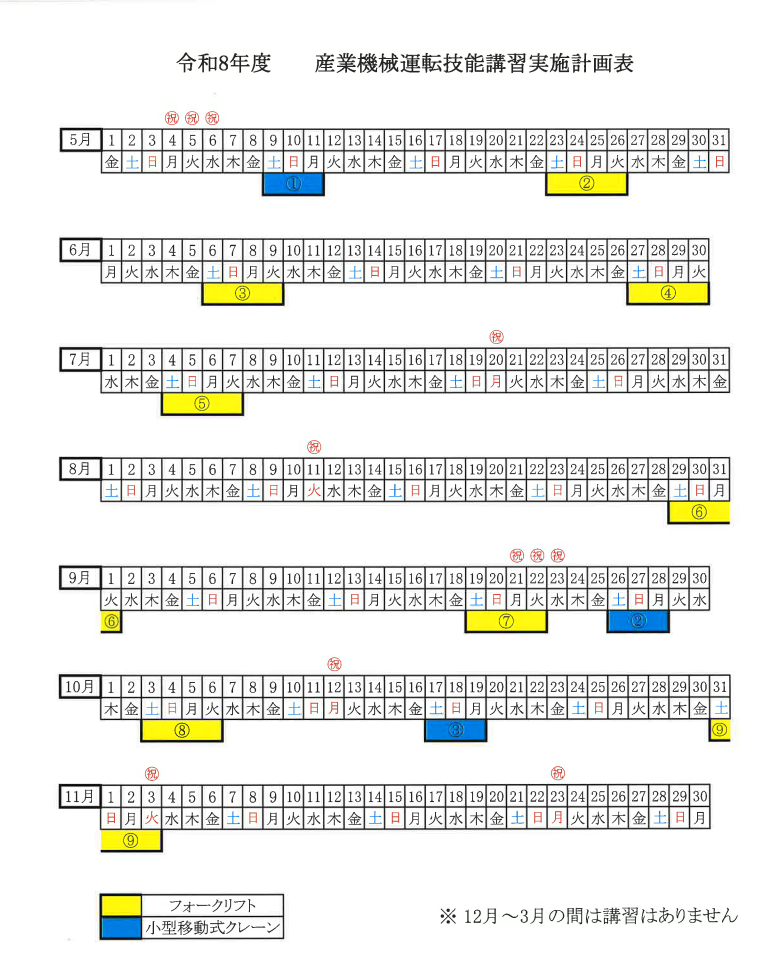 | ■フォークリフト運転技能講習 ■小型移動式クレーン運転技能講習 ■玉掛け技能講習 ■講習申し込み方法 ■講習スケジュール表 |